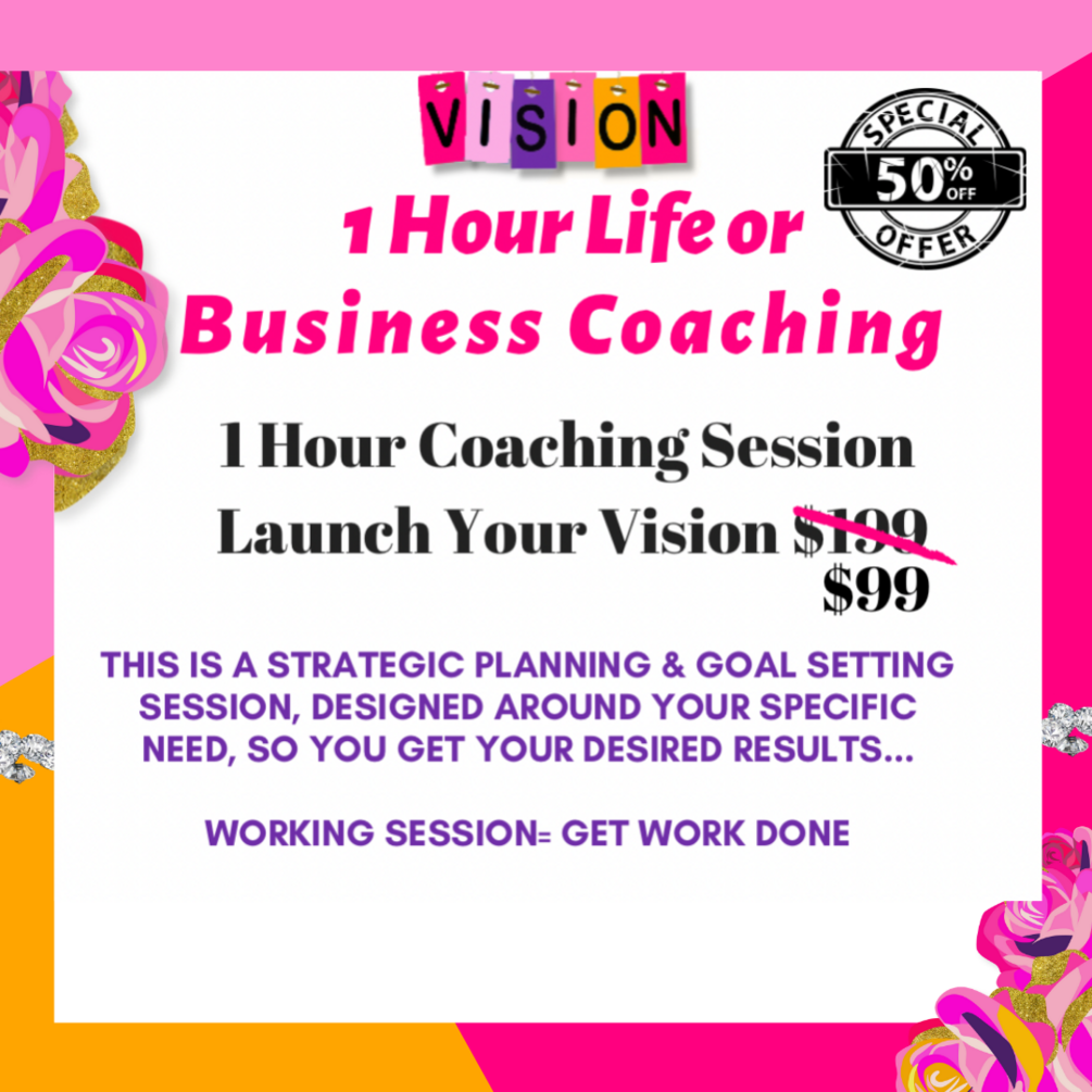 This is a full 1 hour coaching session. We will be stratigically planning and goal setting so you can launch your VISION & get the desired results you have been looking for in life or business.